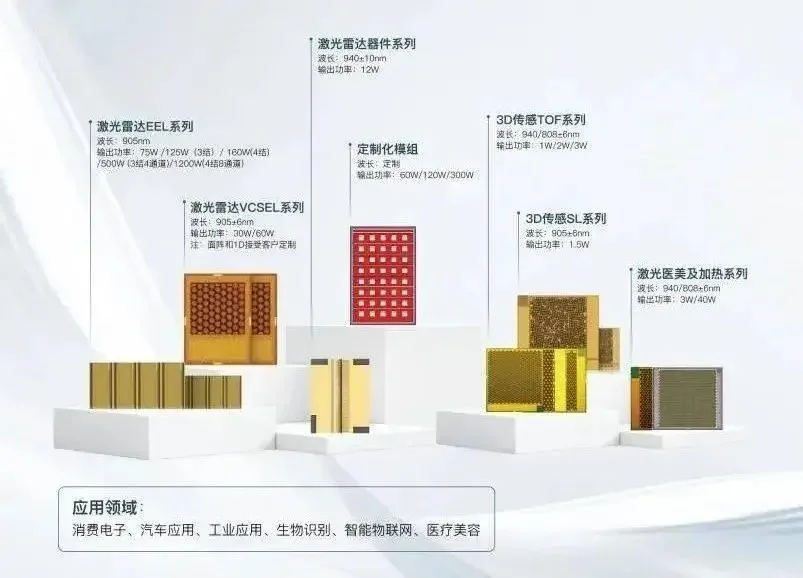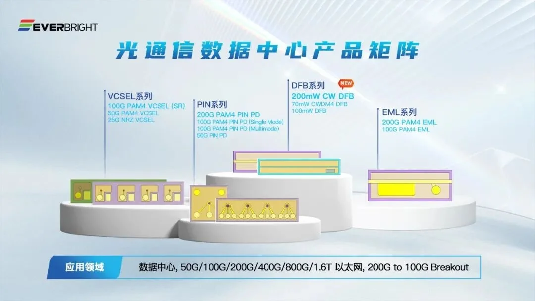 Everbright follows a similar but localized path. Founded in 2012, it adopted an IDM model from the start and achieved breakthroughs in high-power semiconductor laser chips. Its business spans industrial pump lasers, 3D-sensing VCSELs, LiDAR, and high-speed optical communication chips. The company built a leading 6-inch compound semiconductor fab and gradually expanded into optical communications, introducing 10G EML, 100mW CW DFB, and 50G PAM4 VCSEL products serving 10G–800G markets.